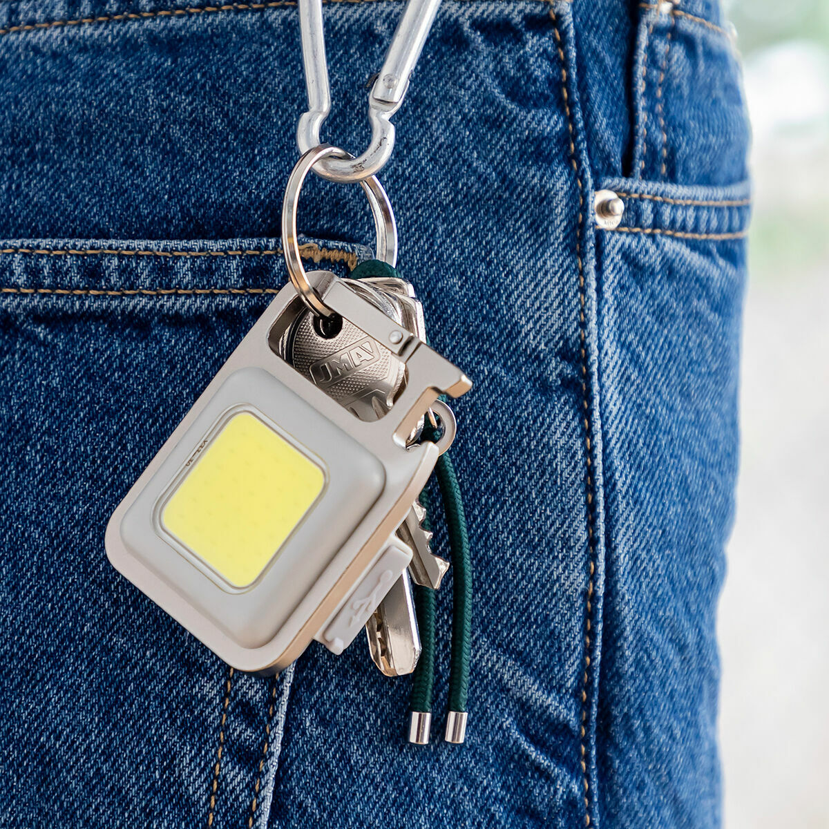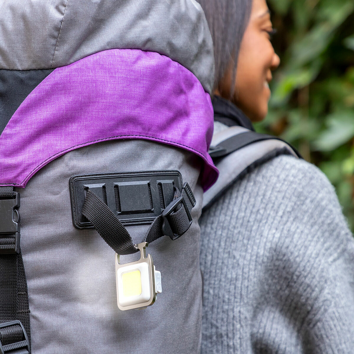 - Carabiner to hang it up like a keyring: this rechargeable mini LED light has a hole on the top which opens and closes so you can hang it like a keyring on backpacks, trousers, bags, etc. That way, it will always be to hand so you can use it whenever you need to.