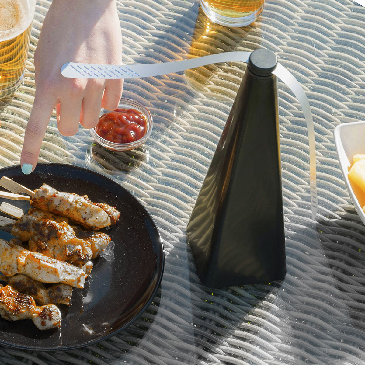 An original eco-friendly fly repeller which is ideal for repelling annoying flies simply, cleanly and effectively. It can be used both indoors and outdoors, perfectly blending into your décor with its modern and elegant design. One of its main advantages is that it is environmentally friendly and does not pollute or is not harmful to health as it does not contain chemical or toxic products. It is also silent so it does not cause any noise disturbance. It features flexible blades with reflective holographic tips which repel flies and other flying insects. This eco-friendly repeller is reusable, lightweight and portable, as it is battery operated (2 x AA, not included). It does not require cables or plugs, so it is very easy to use and take wherever you need it.