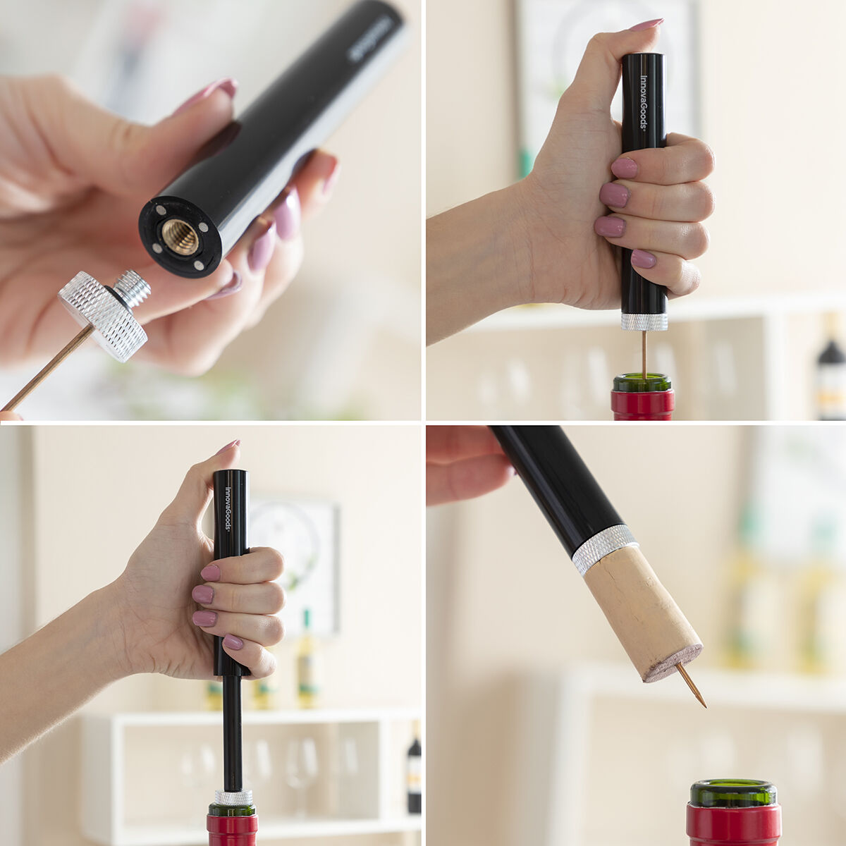 An air pressure corkscrew for wine which is ideal for opening bottles efficiently, quickly and conveniently, and prevents the cork from breaking. The original and elegant design makes it the perfect gift. This manual corkscrew is very lightweight and compact, it is similar in size to a pen, so it takes up very little space and can be transported anywhere and stored easily. It assembles and dismantles easily and includes instructions for use. It is simple to operate. Simply remove the magnetic lid, unscrew it from the base with the needle and pull that base with the needle to remove it completely from the body of the corkscrew. Then turn the base with the needle the other way round and screw it into the body of the corkscrew where the injector or air pump is located. Finally, fully insert the needle into the cork and exert pressure up an down, lifting and lowering the air injector several times, then wait a few seconds for the cork to be fully or partially removed. If necessary, slowly inject air a few more times until the cork comes out fully. The number of times required to activate the air injector depends on the bottle stopper material (cork or synthetic), how long the wine has been bottled for and the temperature of the bottle. The cork is removed using pressure, like when you open a bottle of cava, so you need to take care. Suitable for natural cork and synthetic bottle stoppers.