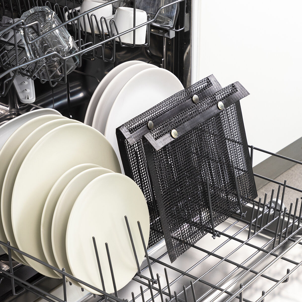 A set of 2 barbecue mesh bags, perfect for grilling vegetables and other small food items without them sticking or falling into the flames and burning. They are very practical and easy to use, you simply place the food in the bags and pit them on the barbecue grill (never directly onto the flames). The foods cook better and have a better flavour, since the smoke passes through the mesh. Simply turn the bags over to cook the other side. By being inside the bags, the foods don’t dispersed or fall into the fire while they are cooking, and once they are cooked they can be removed easily thanks to the non-stick material. The bags are alsoeasy to clean in the dishwasher. A more hygienic and effective way of cooking food on the barbecue.