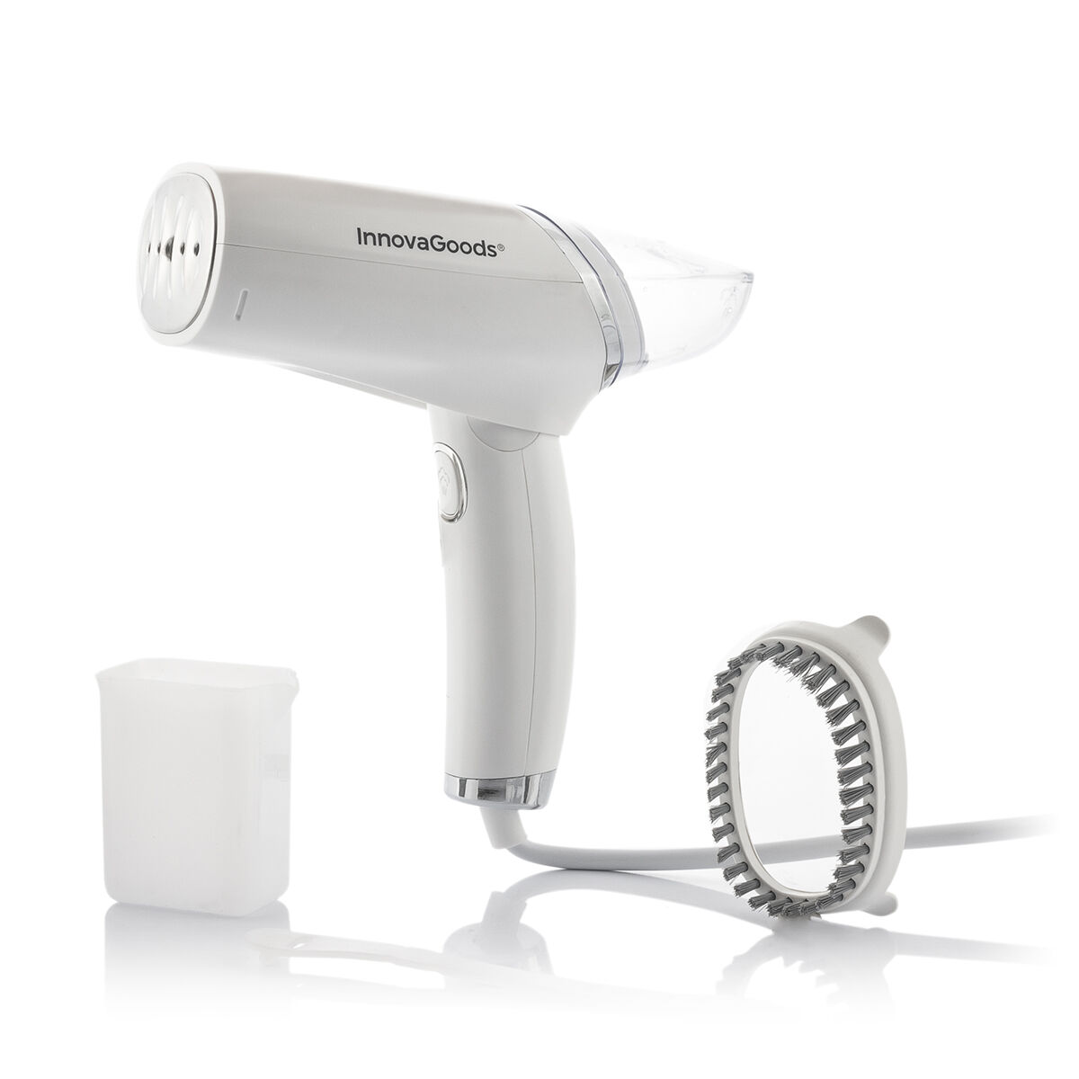 A powerful vertical steam iron (1000W) with folding handle and a modern and compact design that makes transporting it and storing it easier, taking up the minimum amount of space. It heats very quickly (approx. 30 seconds) and can be used vertically or horizontally, depending on needs and preferences. It has a removable tank with 100ml capacity and continuous steam (35 g/min). This original, versatile and portable iron is lightweight, manageable and easy to use. It effectively removes creases and odours and sterilises fabrics. It includes instructions for use and several accessories (measuring cup, lint removal brush and silicone cable tidy). The lint removal brush is ideal for cleaning surface dirt and removing lint from thick materials (such as coats, curtains, etc.)
